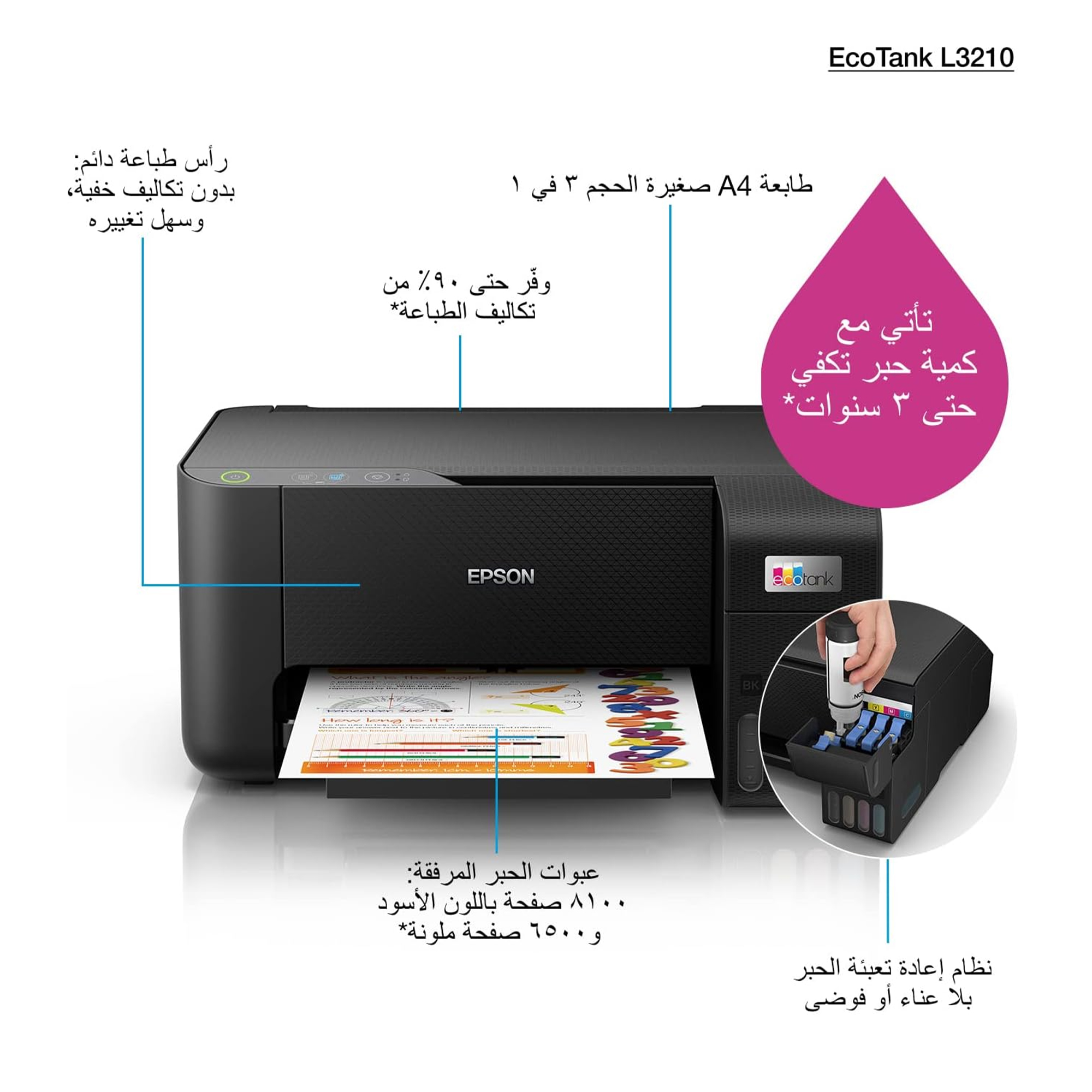زاوية التوفير في الحبر توفر حبر عالي يكفي طباعة آلاف الصفحات بتكلفة قليلة
